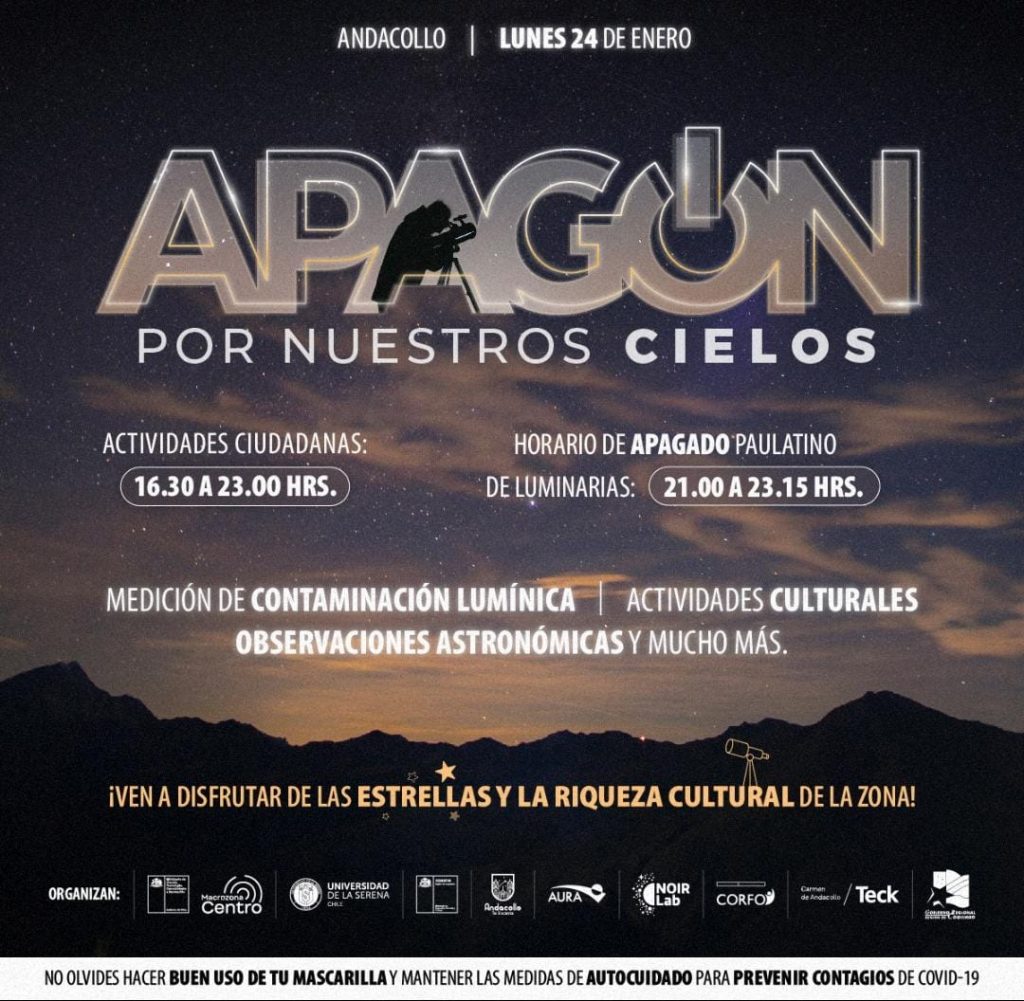 Este Lunes 24 de Enero estaremos en la jornada de actividades que se realizará en Andacoollo en el Apagón por nuestros cielos. Las actividades comenzarán a las 16:30 horas. ¡Te esperamos!