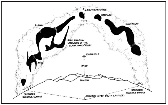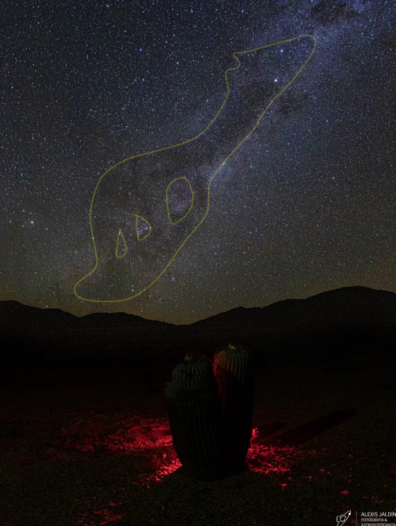 A diferencia de ellos, los antiguos habitantes de los Andes utilizaron las regiones oscuras de la Vía Láctea para construir sus constelaciones, no estrellas. Estas regiones son nubes interestelares de gas y polvo que bloquean el paso de la luz de las estrellas y por eso tienen una apariencia oscura. Estas reciben el nombre de constelaciones oscuras. Emulando la fauna Andina, las constelaciones más conocidas son la llama, Yakana en voz quéchua o Silar en ckunza, la perdiz (Ckolan en ckunza), el zorro, el sapo (Misckan en ckunza) y la serpiente. La llama fue, y sigue siendo hasta nuestros días, uno de los bienes más preciados e importantes del habitante andino. Es una fuente de lana, piel, carne, huesos y combustible; sirviendo además como medio de transporte de carga. Consecuentemente, no sorprende que en las principales representaciones y pinturas rupestres existentes en la zona del Alto Loa, la llama tenga un lugar destacado.