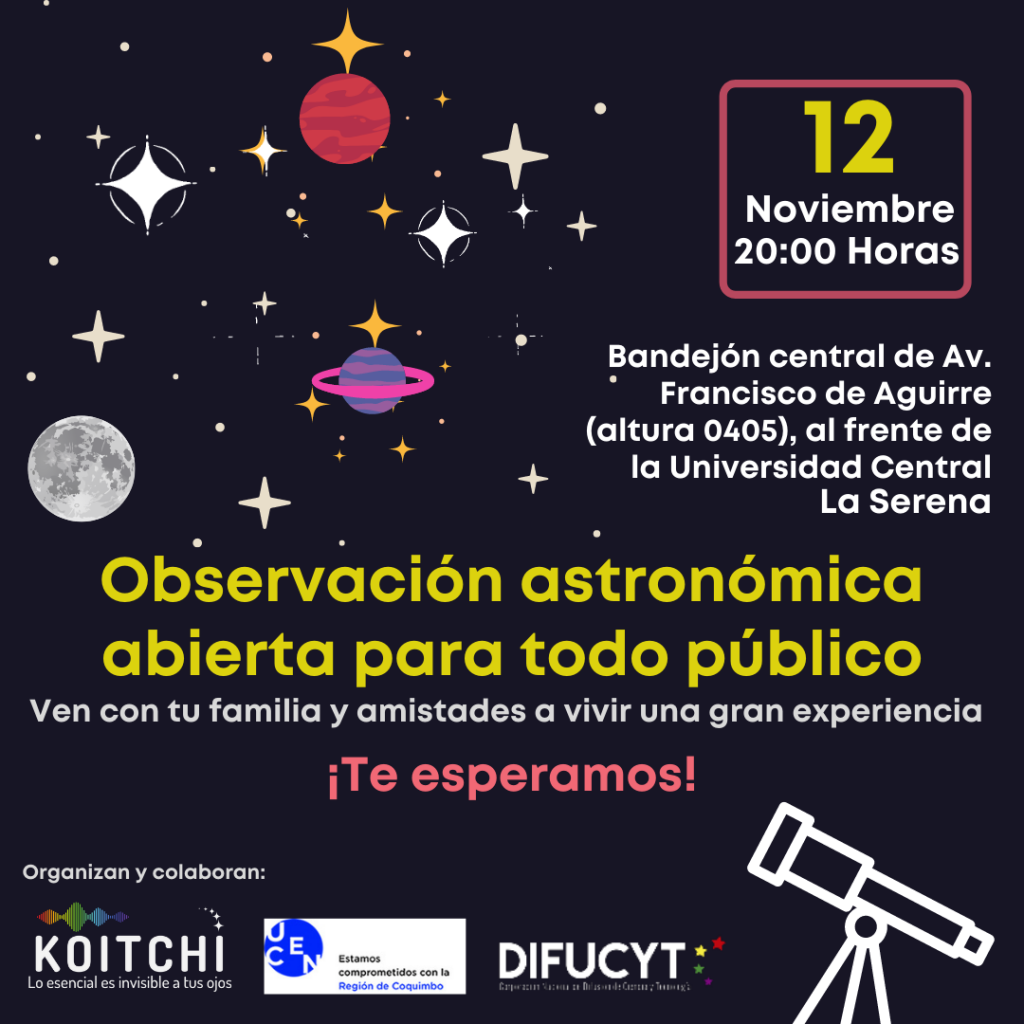 Observación astronómica abierta a todo público. Bandejón central de Avenida Francisco de Aguirre, al frente de la Universidad Central. Lunes 12 de Noviembre 2021 a las 20:00 horas.